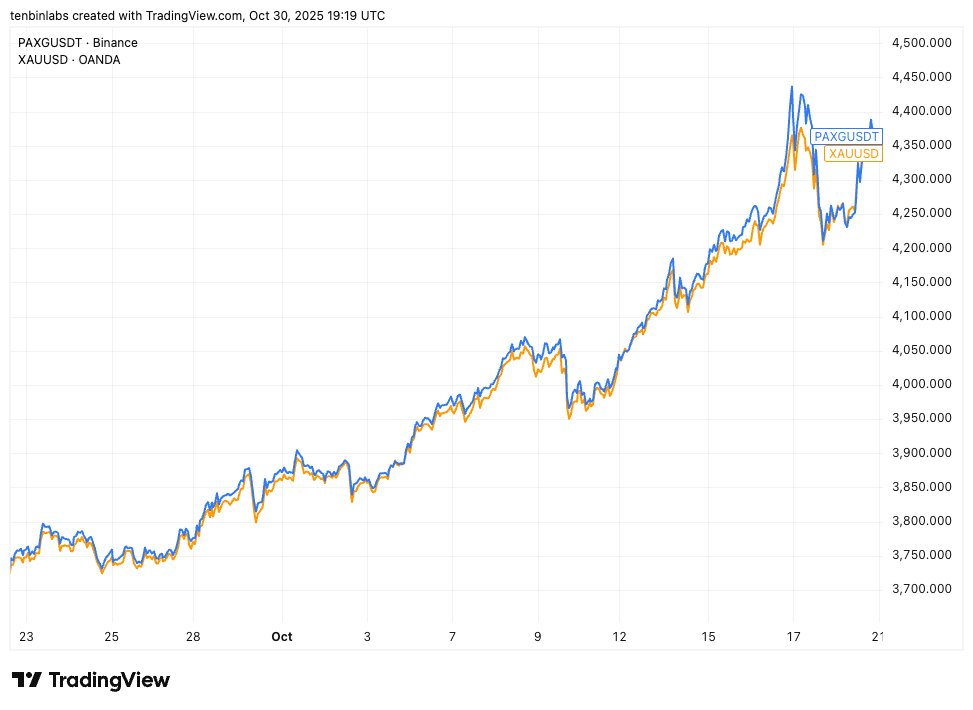 以下是一张简单的价格图表,显示了代币化黄金解决方案之一——PAXG(蓝线)与现货黄金(黄线)的价格走势对比。每个代币代表一盎司现货黄金。然而,在所显示的时间段内,几乎所有 PAXG 的买家都支付了高于现货价格的费用。