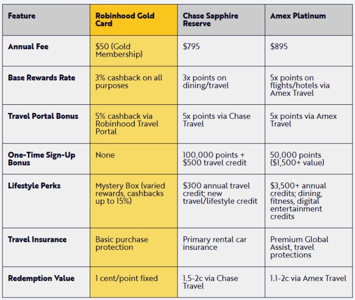 下图对比了 Robinhood 黄金信用卡与竞争对手产品的服务内容。