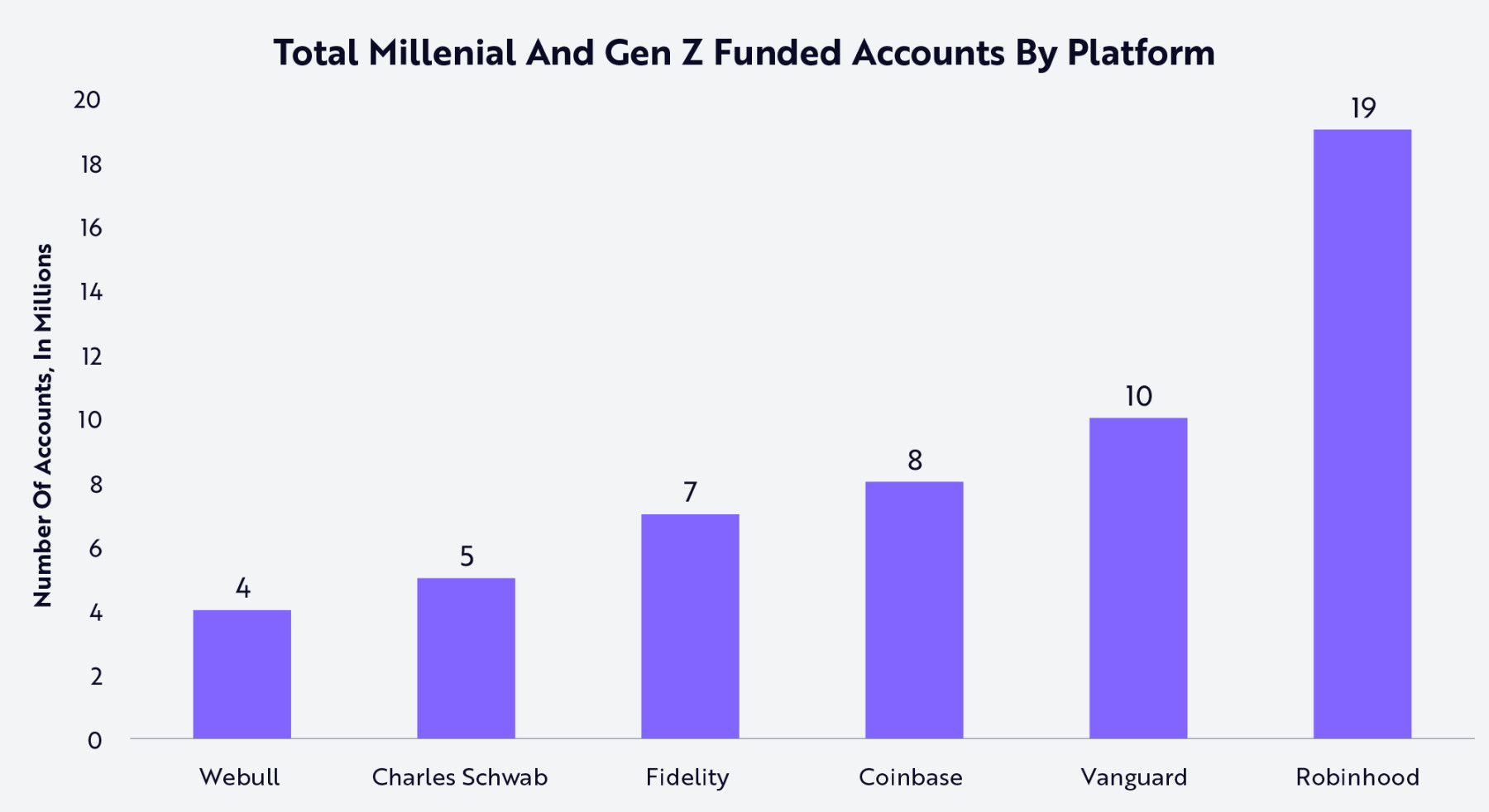 Robinhood 具有结构性优势 — 其千禧一代和 Z 世代账户数量几乎是先锋领航集团(Vanguard)的两倍,达到嘉信理财(Schwab)的近四倍(详见下图)。实际上,Robinhood 63% 的用户为千禧一代和 Z 世代,而嘉信理财这一比例仅为 14%。换言之,如图所示,嘉信理财目前近 60% 的客户仍是婴儿潮一代。