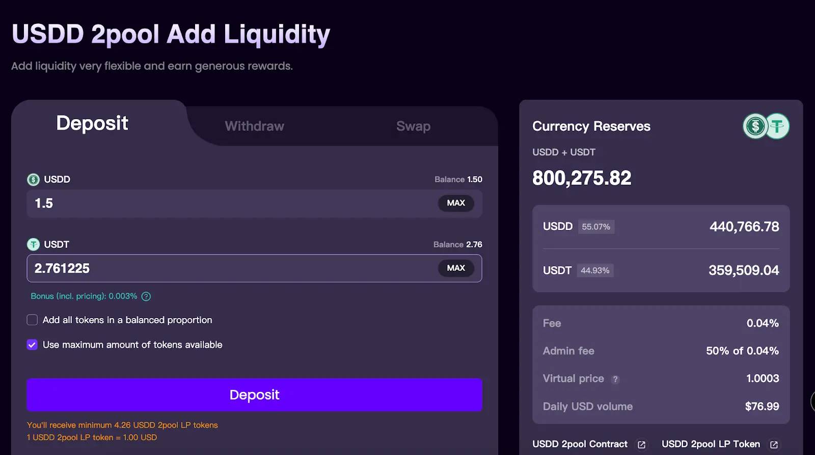 2、质押USDD:在右侧输入框中输入想要质押的 USDD 数量,点击下方“Deposit”,并在钱包中确认交易。交易确认后,页面左侧框将显示 sUSDD 余额,以及sUSDD 对应的 USDD 值。随着时间的推移, sUSDD 的 USDD 价值会自动增加,反映出所获得的收益。