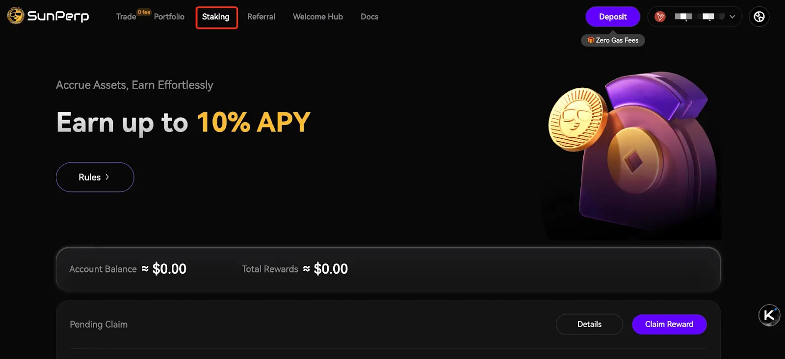 1、准备工作:访问 SunPerp 官方网站(https://www.sunperp.com/),并连接钱包(如TronLink),进入“Staking”页面。