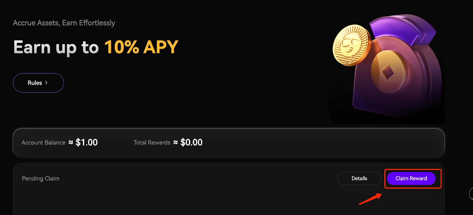 3、领取收益:奖励将于 T+2 日 09:00 (UTC) 以 USDT 形式发放。例如:如果用户在 1 月 1 日存入 USDT,则将在 1 月 2 日进行资产快照以计算收益,奖励将在 1 月 3 日 17:00 (UTC+8) 发放。点击下方“Claim Reward”按钮即可领取收益。