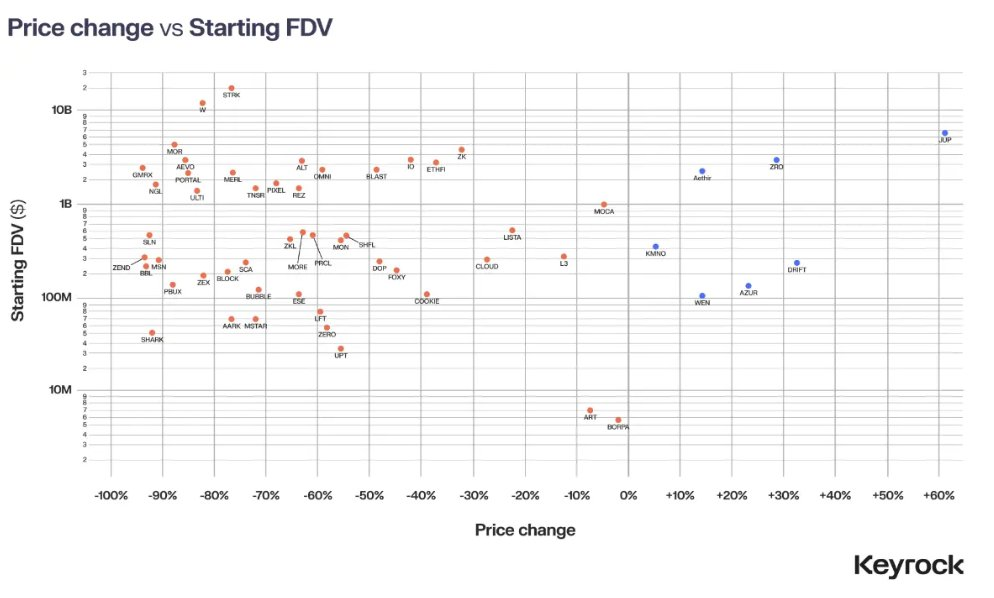 过高的 FDV 会毁掉代币的价格;要明白,空投并不会违背基本估值逻辑而产生“魔法”。在 2024 年,许多空投项目以极高的 FDV 上线,但在两周内价格迅速暴跌 50%-80%。