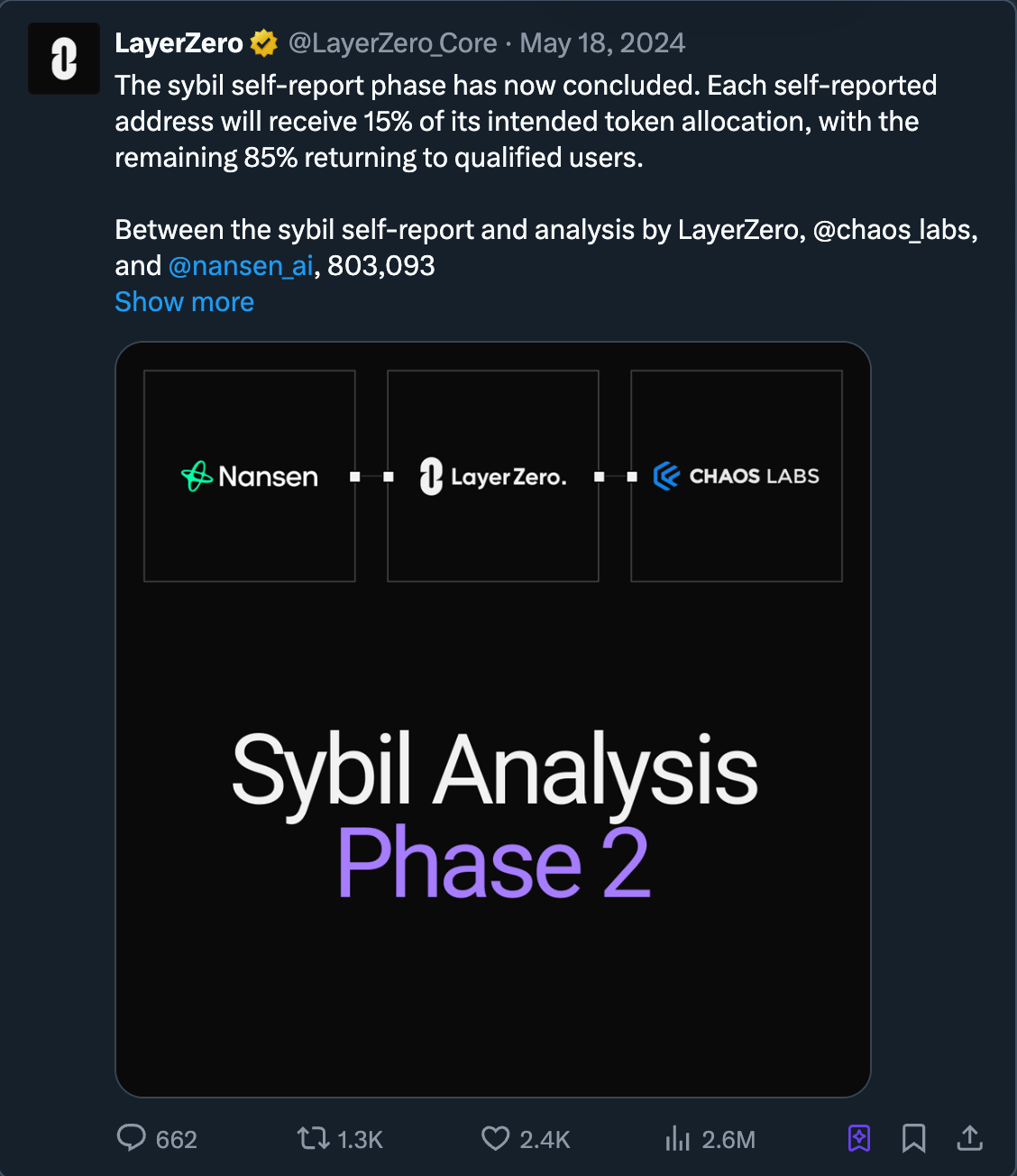 一些项目会对难以伪造的行为给予更高的奖励(例如长期活动、链上声誉 NFT 或 KYC)。LayerZero 在 2024 年就曾标记了 80 万个地址为 Sybil 地址,并计划将其奖励削减至正常水平的 15%。