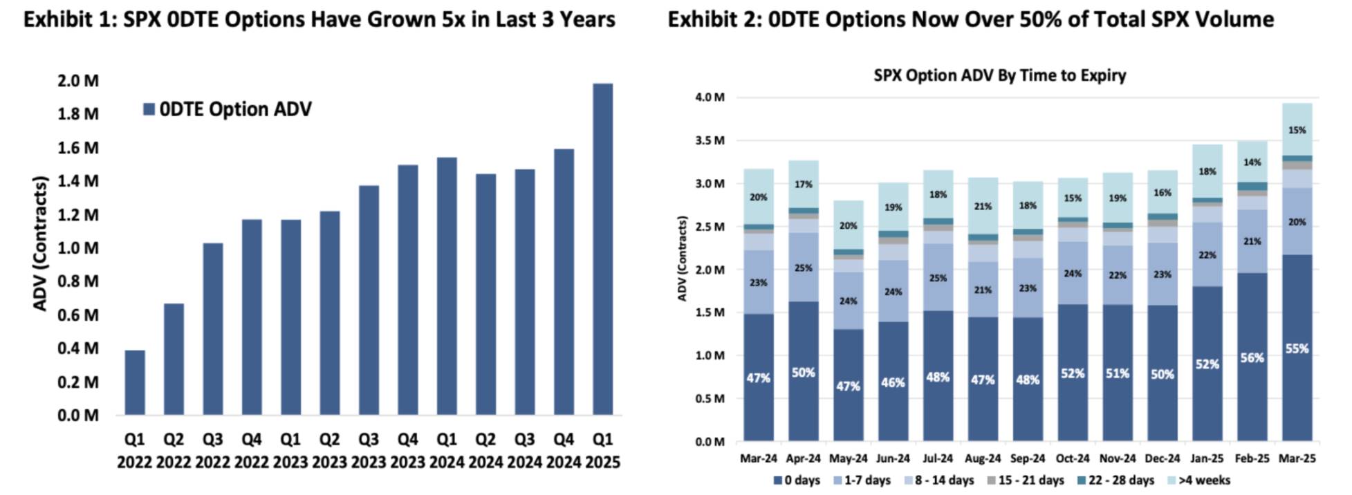 全球股票市场价值约 100 万亿美元,几乎是整个加密市场规模的 25 倍。仅美国股票市场就价值约 60 万亿美元。就像在加密领域一样,股票市场参与者对杠杆有着强烈的需求。这在 0DTE 期权的爆炸性增长中显而易见,这些期权主要由散户投资者交易,占 SPX 期权交易量的 50% 以上。散户投资者显然希望获得对标的资产价格变动的杠杆敞口,这一需求可以通过代币化股票的永续合约直接满足。
