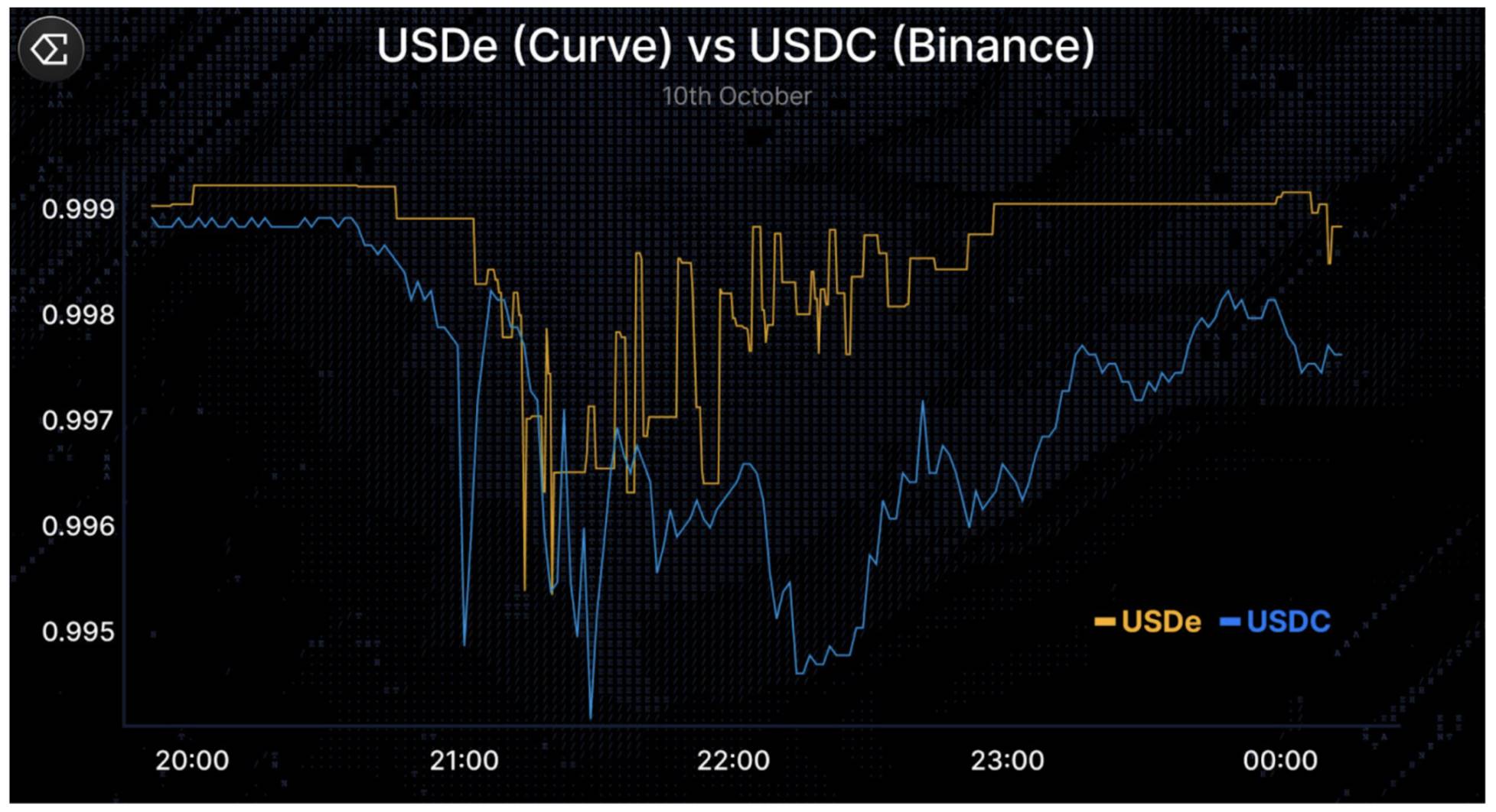 2025 年 10 月 10 日,加密市场经历了一次极端的去杠杆化事件,随着主要 CEX 和 DEX 的未平仓合约崩溃,数小时内约有 200 亿美元的头寸被清算。在连锁清算过程中,由于 Binance 的预言机设计,USDe 在 Binance 上短暂交易至低至约 0.65 美元,这引发了批评。然而,USDe 在更具流动性的链上场所(如 Curve)上保持接近平价(参见下图),并且赎回功能继续正常运作,表明这是特定场所的错位,而非系统性的脱锚。Guy 在 X 上的这条推文是理解 10 月 10 日事件的绝佳阅读材料。