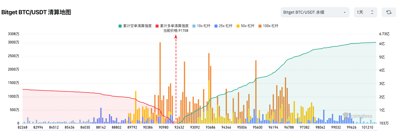3、Bitget清算地图数据显示,BTC/USDT当前价格 91,708美元,BTC 位于多空清算密集区,稍有波动就会引发扫杠杆行情,上破 93,000美元 容易造成空头连环爆仓,下破 90,200美元 则会触发多头集中清算。