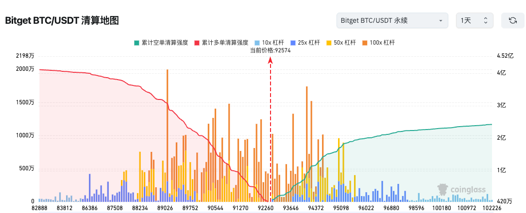 3、Bitget BTC/USDT清算地图显示BTC当前价 92574 USDT90000-94000区间多单清算密集,若下破或引发连锁清算风险,短线需警惕放量下跌;