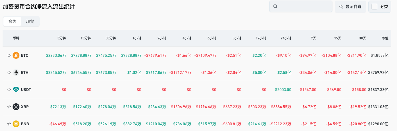 4、过往24小时内,BTC、ETH、USDT、XRP、BNB等币种合约交易净流出领先,或存在交易机会;