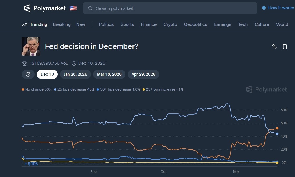 12月不降息的概率已大幅上升,这已成为传统市场和预测平台的普遍预期。尽管近期政治局势动荡,但交易员似乎更关注数据和央行的沟通。