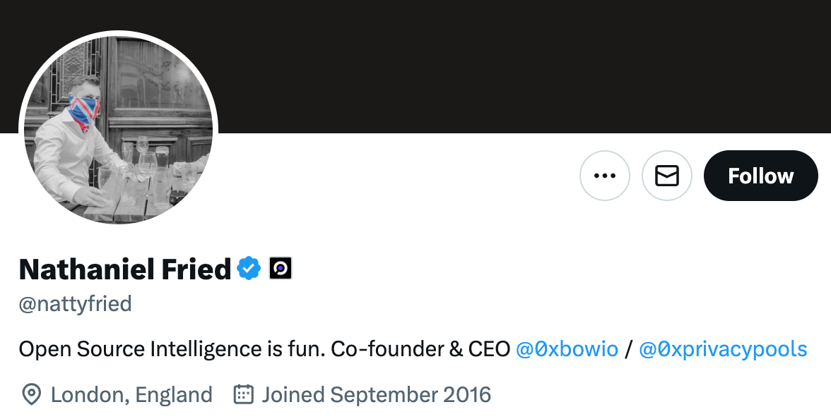Nathaniel Fried 相对没有前两位那么资深,其在 0xbow 之前曾在专注于国家安全的 Blacklake 和英国的开源情报公司以及非盈利组织工作。Nathaniel Fried X 账号的介绍中也表达了对开源情报的浓厚兴趣。