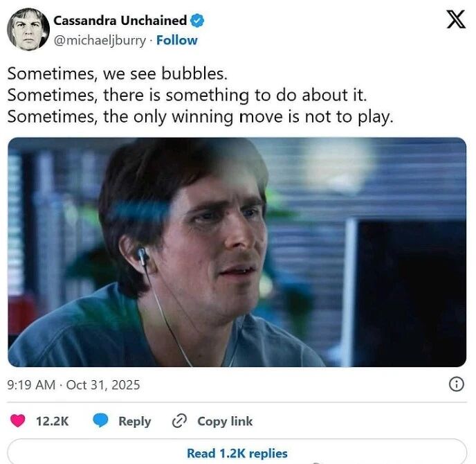 伯里本人也打破了两年的沉寂,在X上发帖,配图正是《大空头》中他的角色盯着电脑,文案是:“有时,我们能看到泡沫。有时,我们能有所作为。有时,唯一的胜利方法就是不参与。”