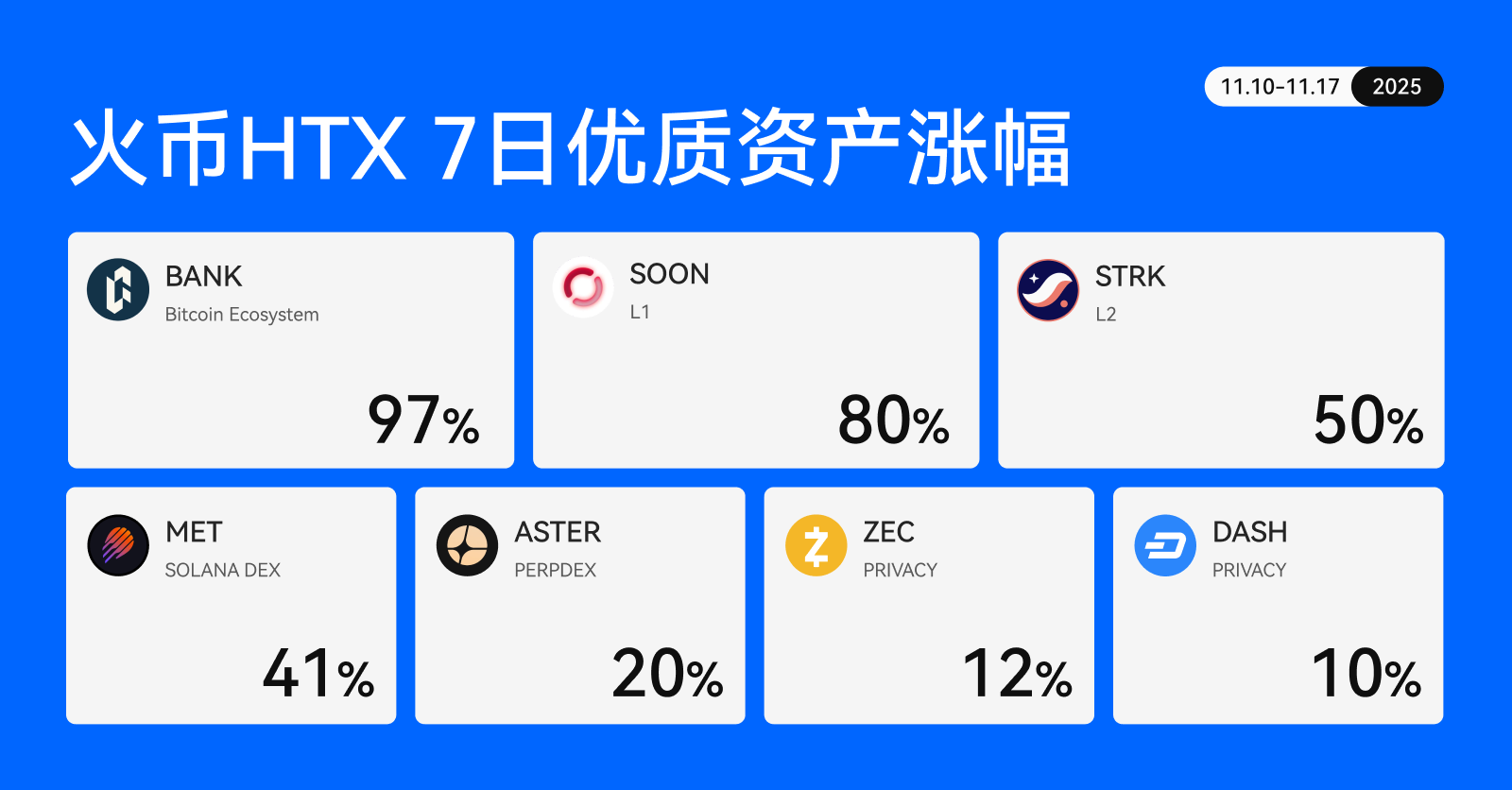 火币 HTX 上新资产一周回顾(11.10–11.17):BANK 飙涨 97%,L1 与 L2 赛道同步回暖