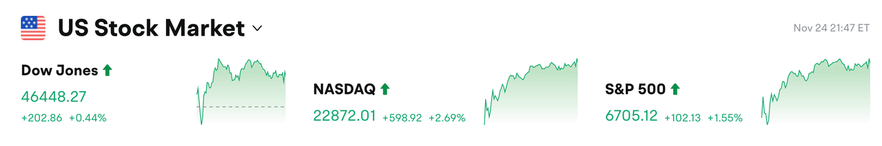 2、美股:道指涨0.44%,标普500指数涨1.55%,纳斯达克综合指数涨2.69%。