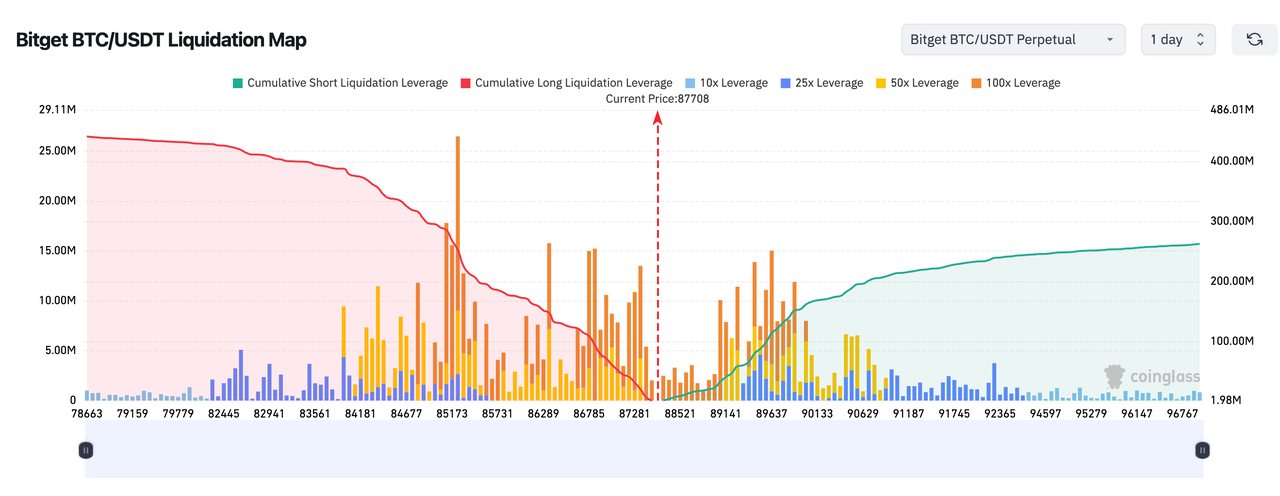 3、Bitget BTC/USDT清算地图显示:BTC 当前价 87,708 美元附近,下方 85,400–86,500 属于多头高杠杆密集区,一旦回落至该区间将触发多头连续清算。上方 89,000–90,500 空头累积杠杆集中,若价格上冲到该区间,容易引发空头爆仓并推升行情。