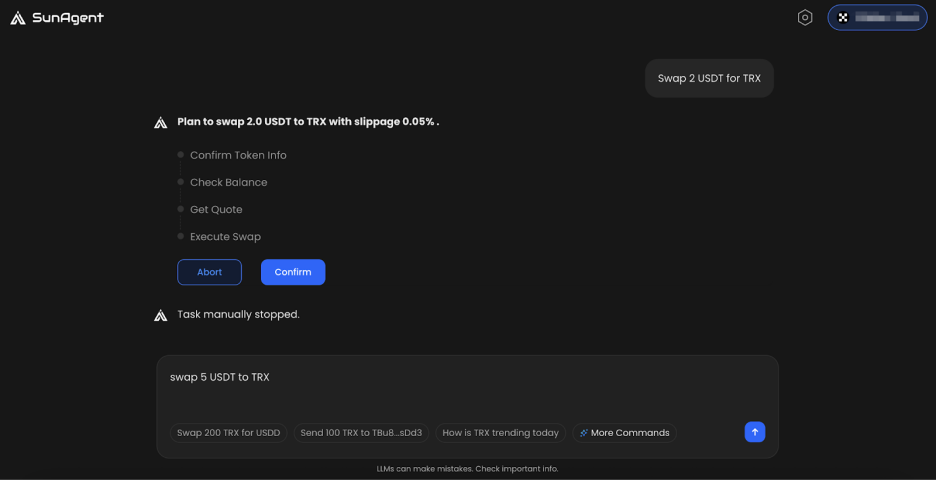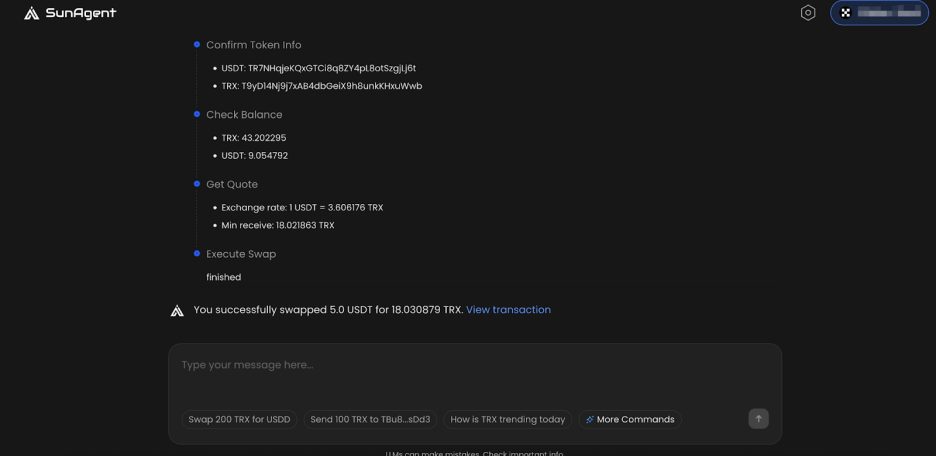 SunAgent的全面升级,标志着波场TRON的链上交互正式迈入智能对话的新纪元。通过自然语言理解与波场TRON生态的深度整合,它将复杂的区块链操作转化为直观的对话体验,在确保资产安全的前提下,让每位用户都能轻松驾驭去中心化世界。从交易兑换到资产发行,从资源管理到数据查询,SunAgent正以前所未有的方式降低着区块链的使用门槛。欢迎立即体验SunAgenthttps://sunagent.ai),用自然对话开启智能链上之旅,共同见证区块链交互模式的革命性变革。
