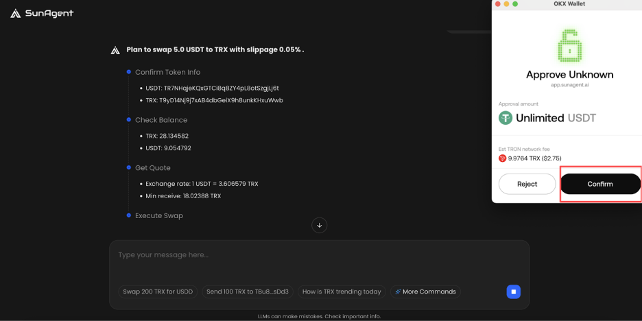 3、钱包授权:此时,钱包会自动弹出交易签名请求窗口。请在此窗口内再次核对交易详情,确认无误后,在钱包中点击“Confirm”,完成交易的最终授权,SunAgent 将自动按照计划完成用户意图。