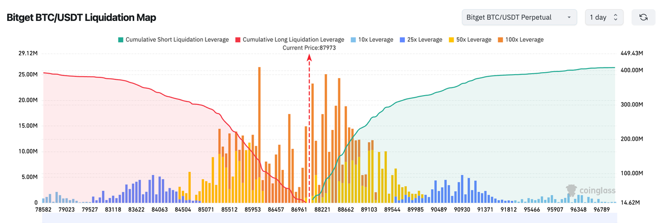 3、Bitget BTC/USDT清算地图显示:当前价 87,973 正处于“多头绞肉机”核心区,上方 88,200–91,000 堆积巨量 50x–100x 多单,突破 91k 将引爆多头清算瀑布直冲 95k+;下方空头清算墙极薄,跌破 86k 几乎无强支撑,市场极度一面倒看多,假突破猎杀风险高。