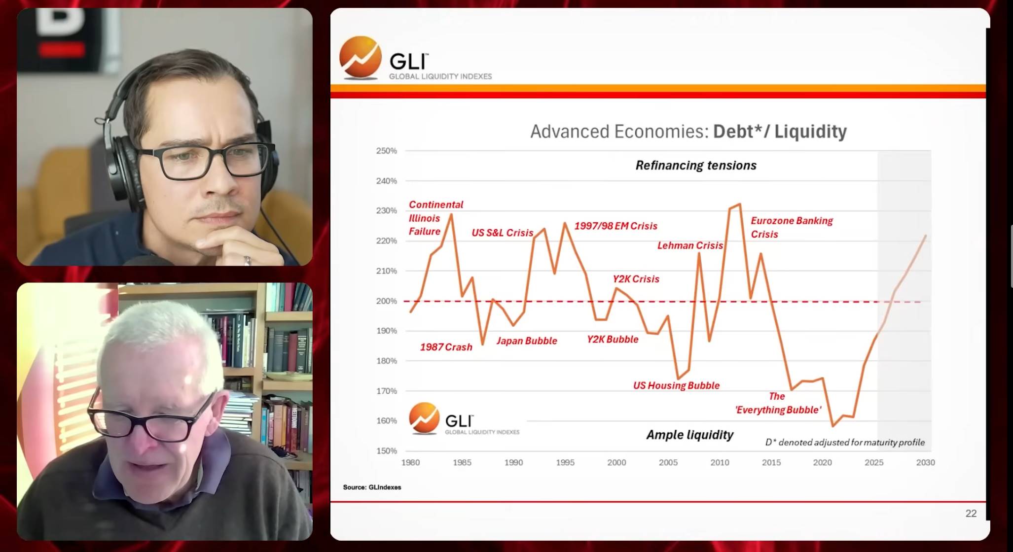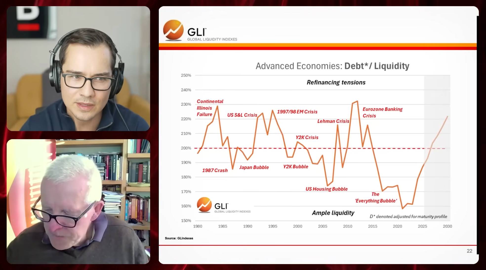 当这一比率过高时,意味着债务水平与流动性之间的关系过于紧张,可能导致融资困难或再融资压力,从而引发金融危机。相反,当流动性远远超过债务时,可能会催生资产泡沫。回顾过去,我们经历了一个被称为“全面泡沫”的阶段,这一阶段的特点是流动性极为充裕,而债务压力相对较低。现在,我们正逐步从这一阶段过渡出来。