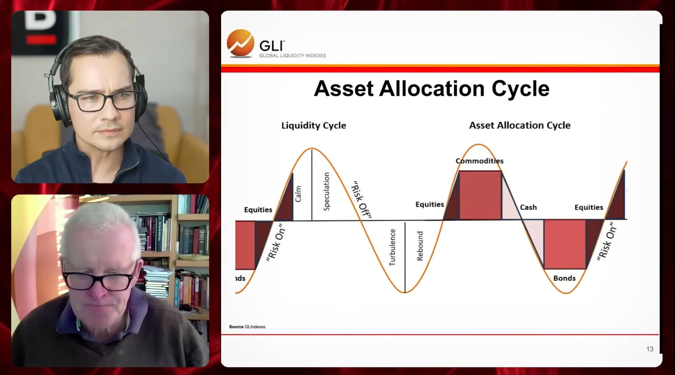 从表现来看,股票的收益优于信贷,信贷的表现又优于债券。商品市场现在开始回升。科技股一直是市场的领头羊,金融股在过去18个月全球范围内表现出色。而能源商品,例如黄金矿业公司,今年表现尤为亮眼。这些迹象表明,这实际上是一个典型的周期。