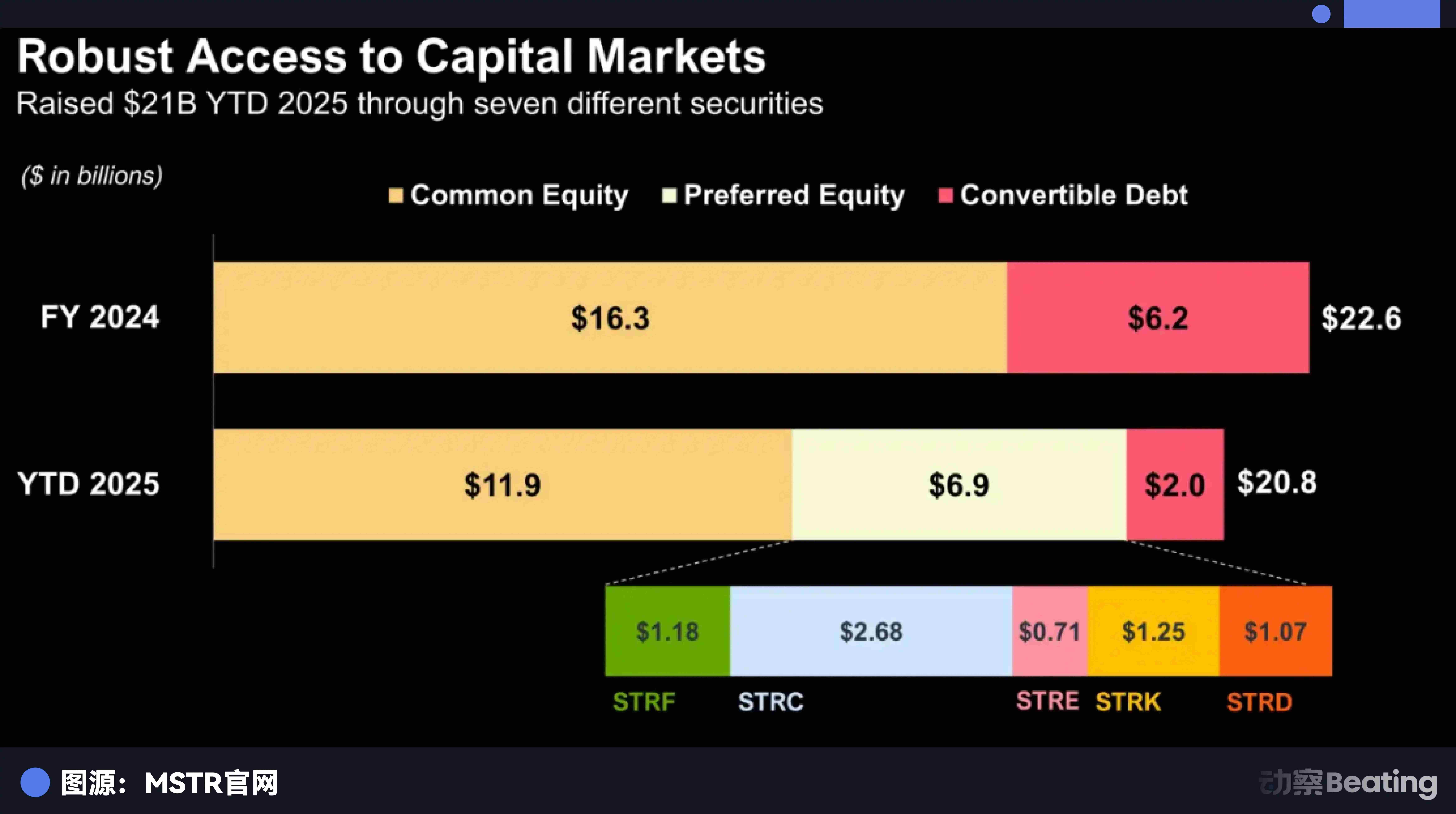 MSTR 今年已募得 208 亿美元的高额资金,这个规模在美国上市公司的年度募资中极为罕见。资金来源分别为普通股 MSTR 119 亿美元、优先股 69 亿美元、可转债 20 亿美元。