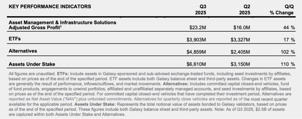 Galaxy 25Q3 资产管理业务的调整后毛利、AUM(包括 ETF 和另类产品)以及质押资产规模