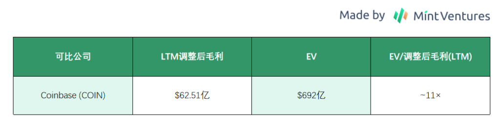 按此方式计算,Coinbase 2024 年第四季度至 2025 年第三季度的净营收合计约为 73.7 亿美元,同期交易相关的成本(Transaction expense)约为 11.19 亿美元。二者差额即为「LTM 调整后毛利」约为 62.51 亿美元。以此计算,其 EV/ 调整后毛利 (LTM) 约为 11 倍。