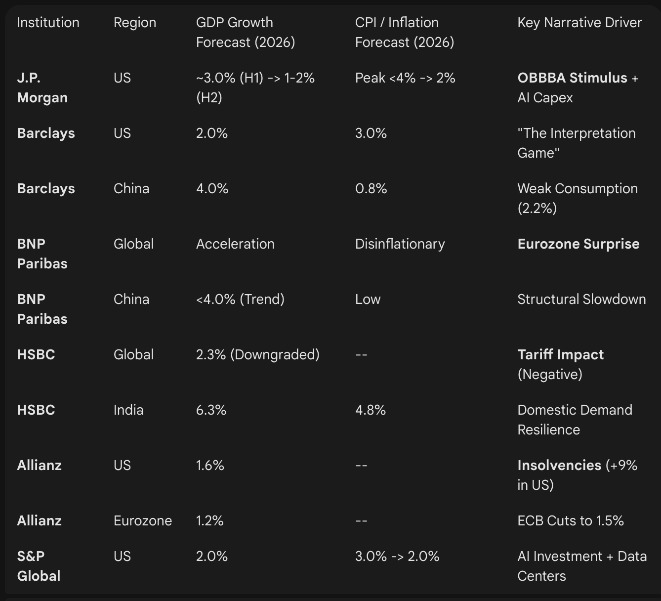 2026年注定成为一个深刻结构性变革的时期,其特征不再是单一同步的全球周期,而是一个复杂多元的经济现实、政策脱节和主题性颠覆交织的矩阵。这份全面的研究报告汇集了全球领先金融机构的前瞻性策略和经济预测,包括摩根大通资产管理(J.P. Morgan Asset Management)、贝莱德(BlackRock)、汇丰环球私人银行(HSBC Global Private Banking)、巴克莱私人银行(Barclays Private Bank)、法国巴黎银行资产管理(BNP Paribas Asset Management)、景顺(Invesco)、普信集团(T. Rowe Price)和安联集团(Allianz)。