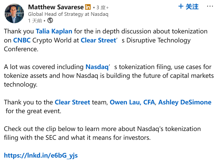 11 月 25 日,纳斯达克数字资产战略负责人 Matt Savarese 在接受 CNBC 采访时明确表示,已将代币化股票方案的 SEC 审批视为首要任务,将「以最快速度推进」,同时他也谨慎地强调,纳斯达克并非试图颠覆体系,而是要在监管框架下以「负责任」的方式推动资产上链。