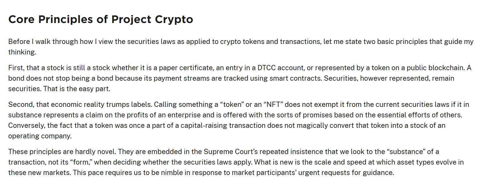 「无论股票是以纸质凭证、存托信托及结算公司(DTCC)账户记录,还是通过公共区块链上的代币形式呈现,它本质上仍然是股票;债券不会因为其支付流通过智能合约追踪,就不再是债券。无论以何种形式呈现,证券始终是证券,这一点很容易理解。」
