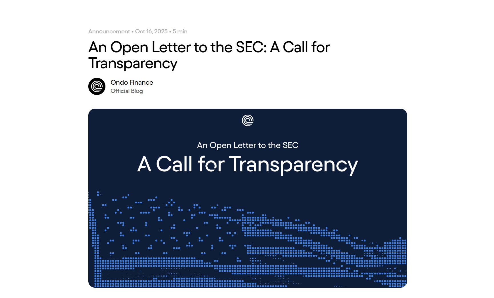 但颇具戏剧性的是,就在纳斯达克高歌猛进的同时,来自 Crypto 原生世界的阻击也随之而来。10 月 16 日,RWA 头部发行协议 Ondo Finance 向美 SEC 发布公开信,敦促其推迟批准纳斯达克的规则变更申请,且理由直指「透明度」,指责纳斯达克对结算流程描述模糊。