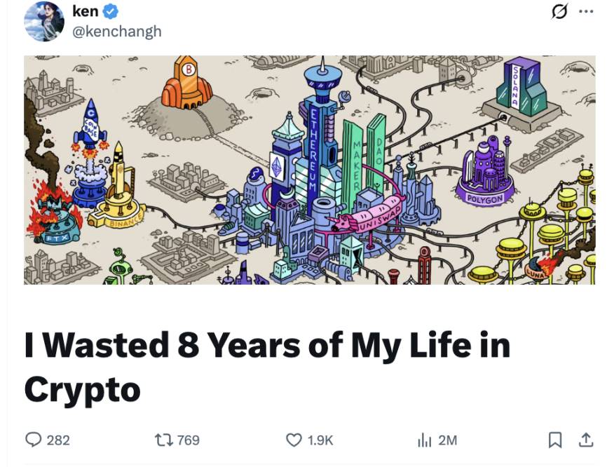 这条推文作者坦言,自己本以为加入了一场革命,到头来却发现只是参与搭建了一个巨型赌场,他为自己助推了经济 「赌场化」 而懊悔。