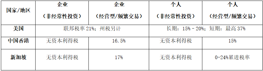 不同司法管辖区的加密货币税收政策存在差异。在美国,无论是偶尔卖币变现,还是频繁交易或经营,只要发生应税交易且有盈利便需要申报纳税,这种一视同仁、「逢赚必税」的税制设计令美国本土加密矿工面临较大的税收压力。相比之下,新加坡和香港的加密税政策则更为友好。这两地目前对个人、企业因非经常性投资获得的加密资本利得均不征税,只要相关交易被认定为非经常性投资收益,投资者便无需为资产升值部分缴税,实现了长期持有的零税率红利。当然,从事频繁交易或经营性业务,仍需就其利润缴纳企业或个人所得税。新加坡的企业所得税约为 17%;香港企业税率为 16.5%。尽管频繁交易者仍需缴税,但相较于美国 21% 的联邦企业税,香港和新加坡的税率无疑具备更强的竞争力。