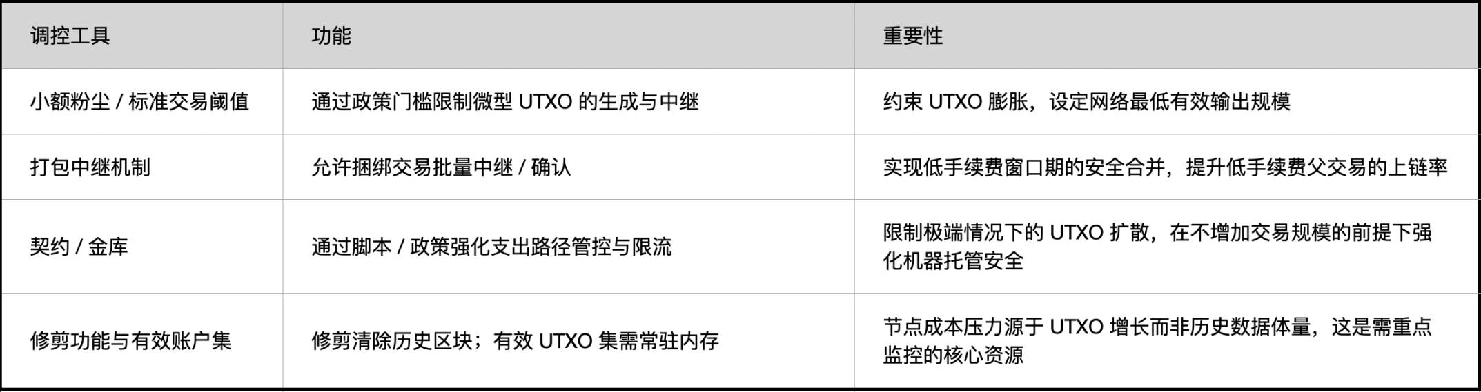 区块链修剪功能只会清除历史区块,不会删除 UTXO。因此压力将转移至非货币层面的调控手段:小额粉尘 / 标准交易阈值、支持安全合并的打包中继机制、以及限制 UTXO 无限扩散的设计。