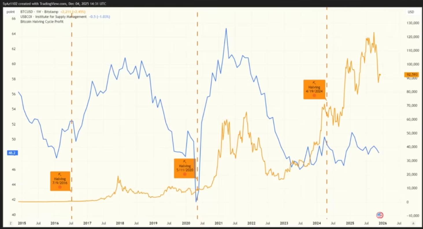 如果四年周期真的存在,那是不是意味着比特币的减半周期比整个美国制造业指数或商业周期还重要?这显然不符合逻辑。比特币只是商业周期中的一个小部分。从我的角度来看,四年周期从未真正存在,2026 年可能会证明这一点,这将彻底推翻这一理论。