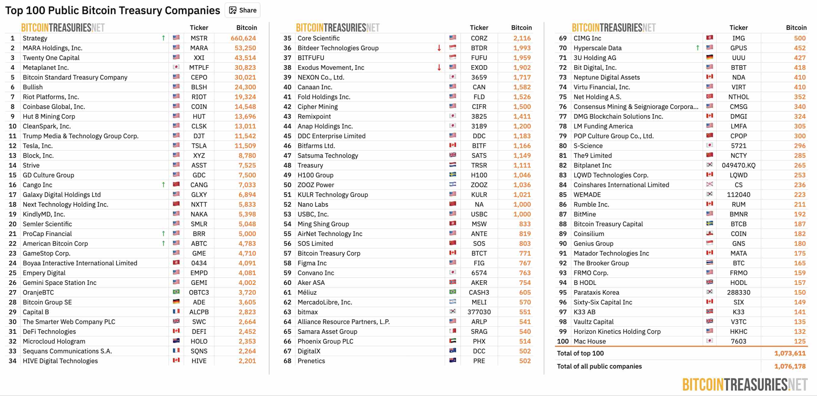 Strategy 并非孤军奋战。据 BitcoinTreasuries.NET 数据统计,截至 12 月 11 日,全球 208 家上市公司持有超 107 万枚比特币,超过比特币总供应量的 5%,当前价值约 1000 亿美元。