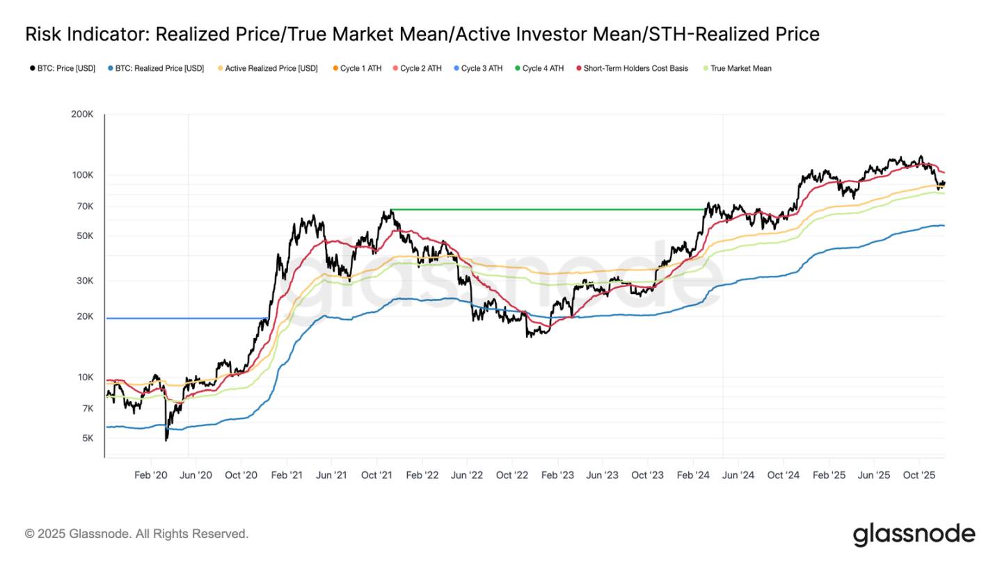 比特币仍处于结构性脆弱的区间内,受到未实现损失增加、已实现损失较高以及长期持有者大量获利了结的压力。尽管如此,需求将价格锚定在真实市场均值之上。
