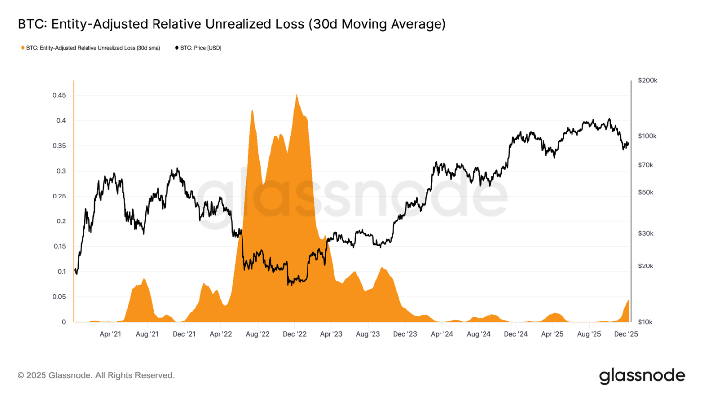 相对未实现损失(30 日简单移动平均线)已攀升至 4.4%,此前近两年均低于 2%,标志着市场从狂热阶段转向了压力和不确定性加剧的阶段。这种犹豫不决目前定义了该价格区间,解决此问题需要新一轮的流动性和需求以重建信心。