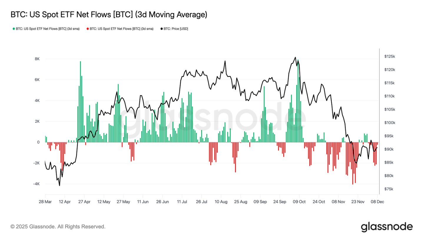 转向现货市场,美国比特币 ETF 度过了又一个平静的一周,三天平均净流入量持续为负。这延续了自 11 月下旬开始的降温趋势,标志着与今年早些时候支撑价格上涨的强劲流入机制明显不同。多家主要发行人的赎回保持稳定,凸显了机构配置者在更广泛市场环境不稳之际采取了更为避险的立场。