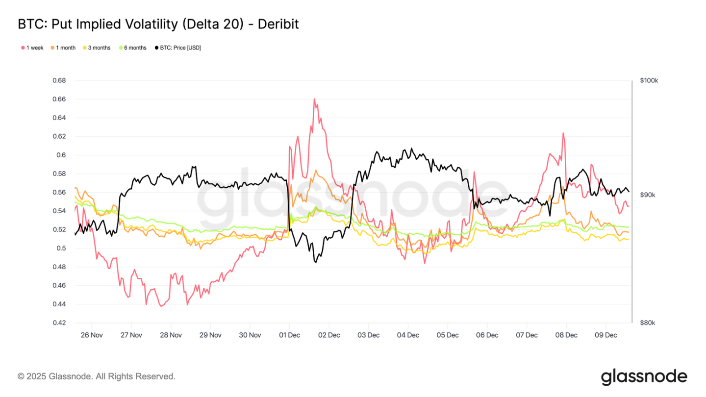 在 20-Delta 看涨期权上,一周期限的 IV 较上周上涨了约 10 个波动率点,而更长期限则保持相对平稳。同样的模式也出现在 20-Delta 看跌期权上,短期下行 IV 上升,而更长期限保持平静。