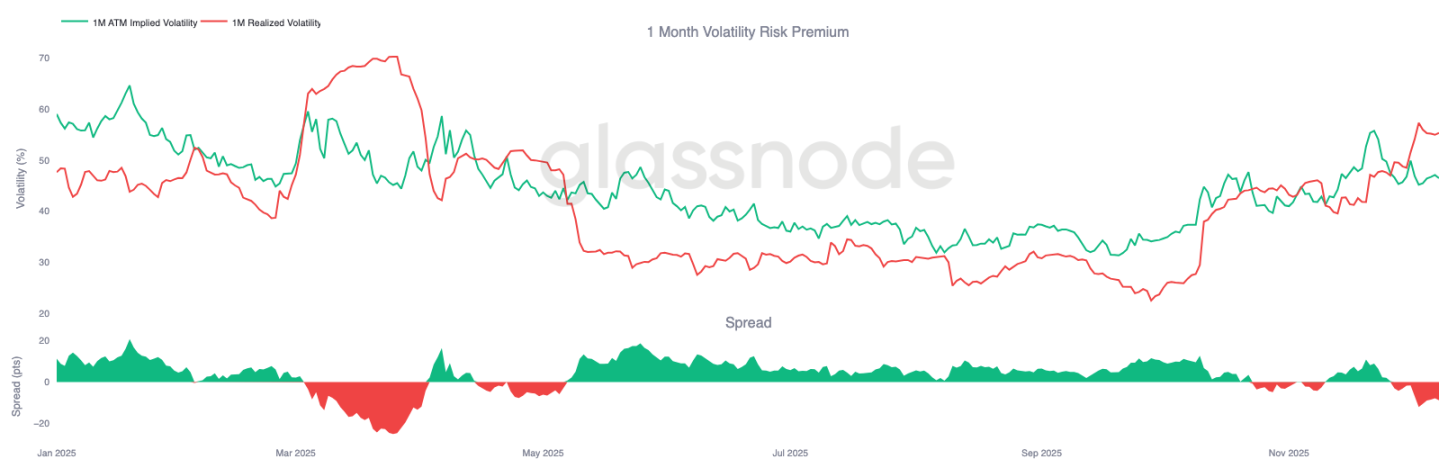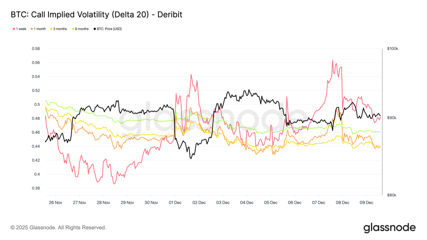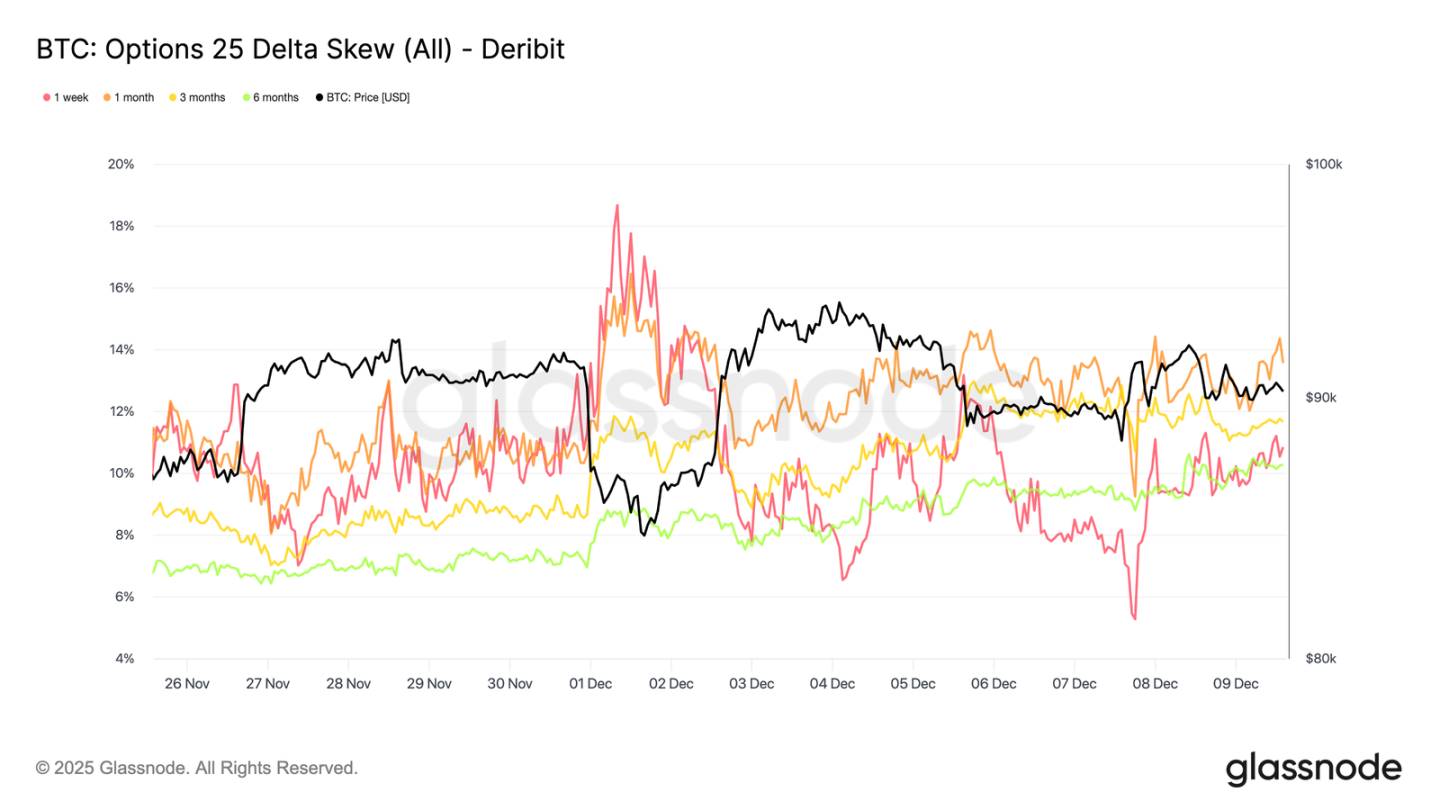 链下状况呼应了这种谨慎基调。ETF 资金流仍为负,现货流动性低迷,期货市场缺乏投机参与。期权市场强化了防御姿态,交易员积累波动率,买入短期下行保护,并在 FOMC 会议前为近期的波动性事件布局。