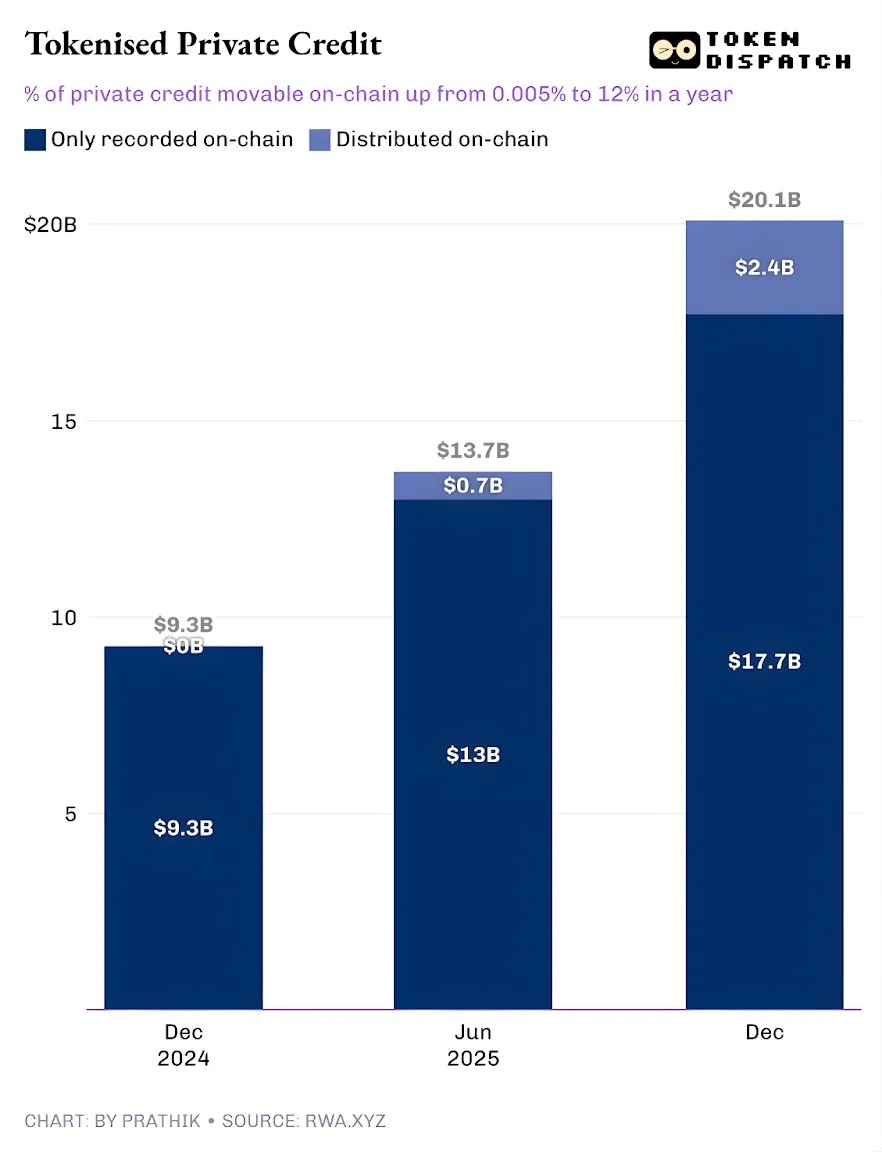 直到去年,几乎所有代币化的私人信贷都只是运营层面的升级。贷款已经存在,借款人也按时还款,平台也正常运作,而区块链只是记录这些活动。所有代币化的私人信贷都只是记录在链上,无法作为代币进行转让。一年之内,这部分可转让的链上份额已经攀升至可追踪私人信贷总量的 12%。
