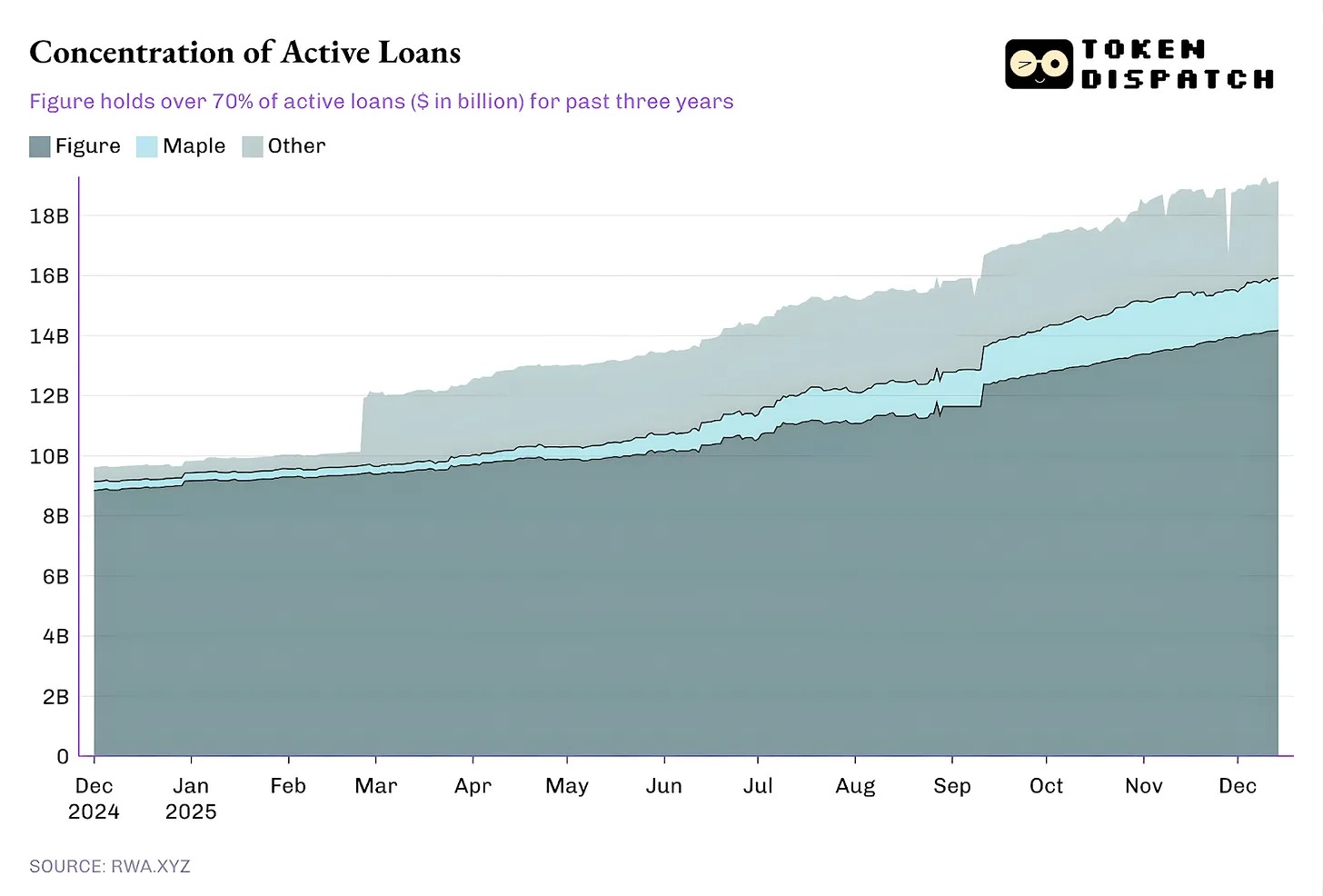 自 2022 年 10 月以来,Figure 一直垄断着代币化私人信贷市场,但其市场份额已从 2 月份的 90% 以上下降到目前的 73%。