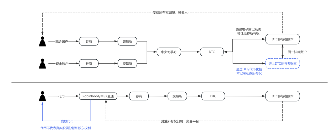 为了让这件事更加通俗易懂,我们画了一张流程图,蓝色部分就是纳斯达克在今年9月的提案中申请改变的部分。可以明显看出,DTC是美股代币化的关键实现和实操机构。