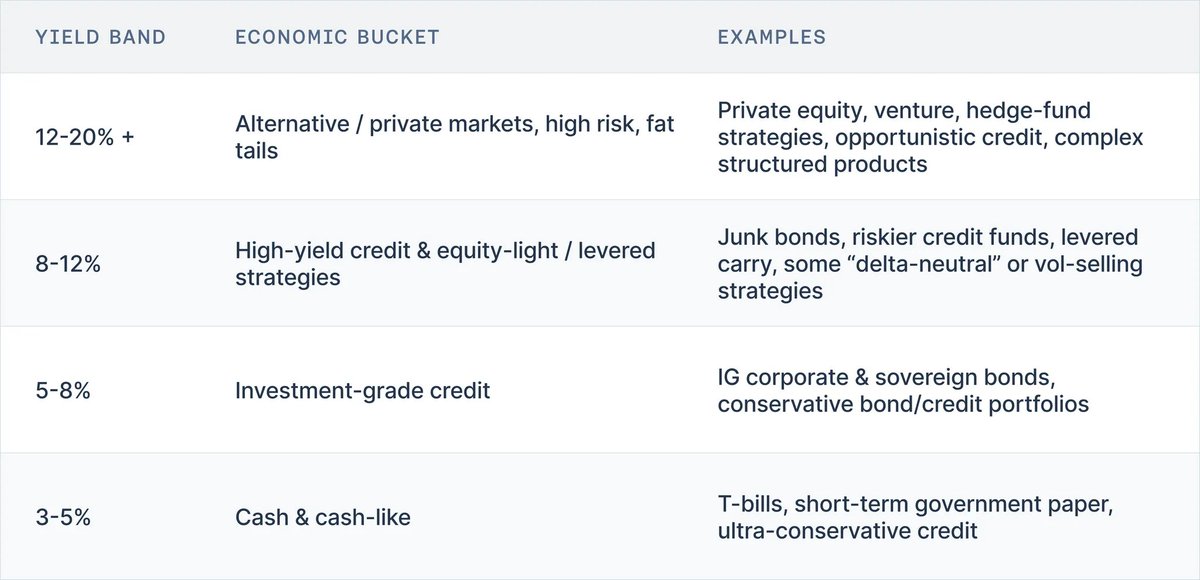 • 12-20%+ → 私募股权、风险投资、对冲基金策略、机会主义信贷、复杂结构化产品