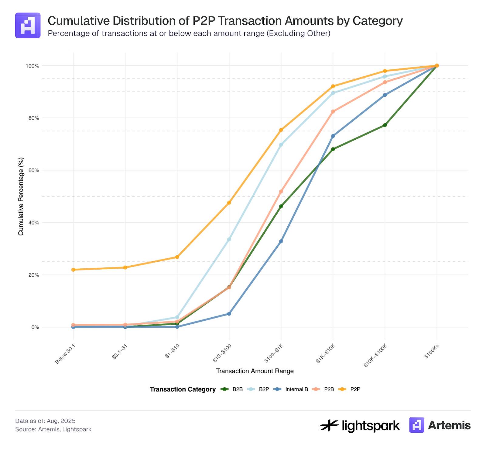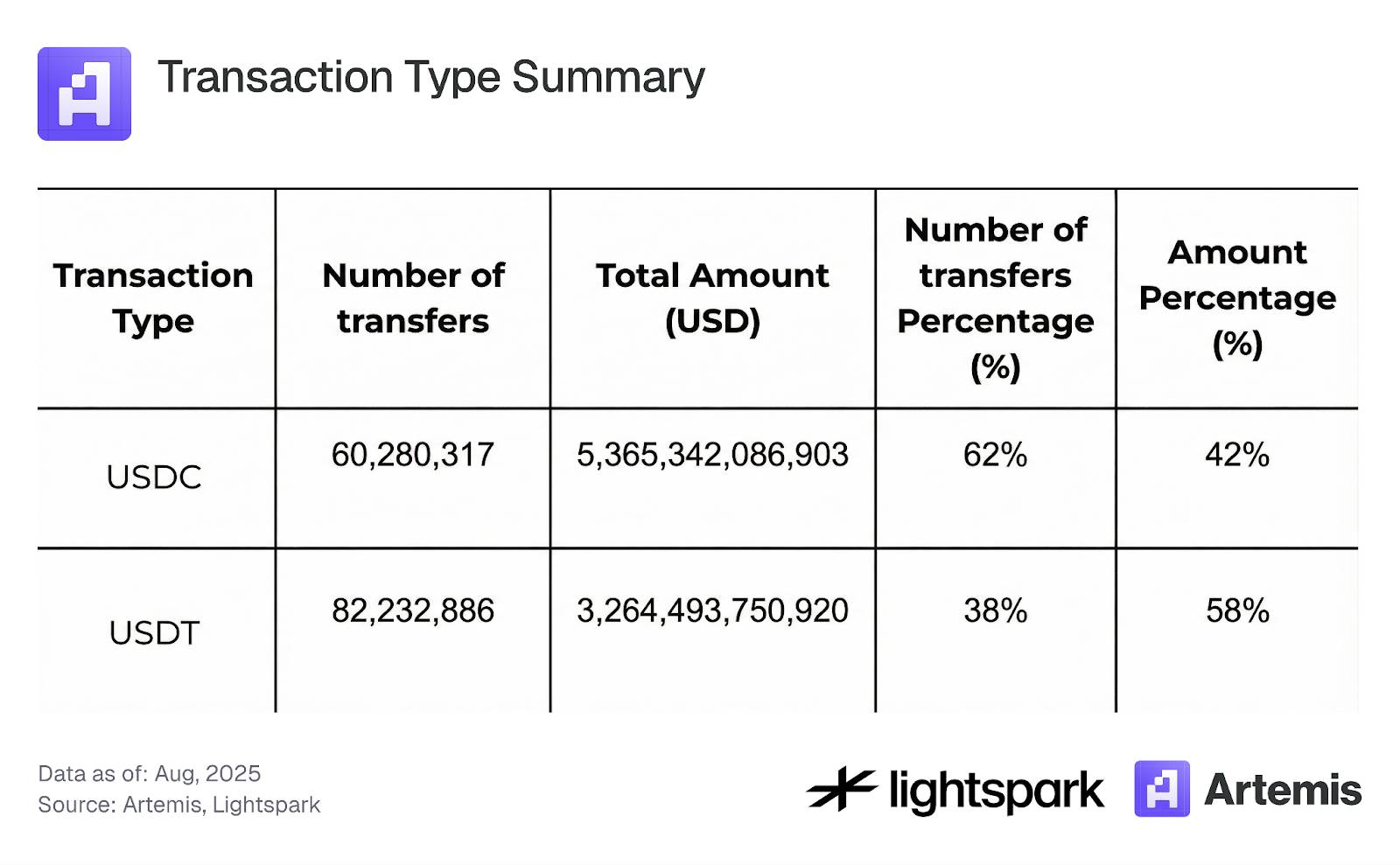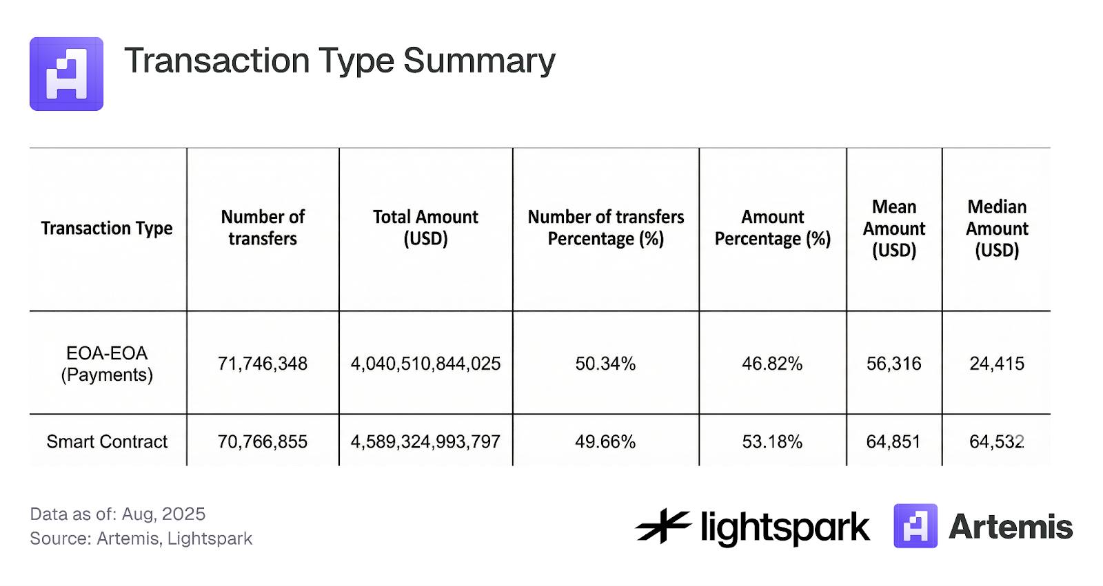 显而易见,稳定币的采用率正在随着时间不断提高,其交易量和交易次数在 2024 年 8 月至 2025 年 8 月期间翻了一倍以上。估算稳定币在支付中的使用情况是一项具有挑战性的任务,越来越多的工具正在被开发以帮助改进这一估算。本研究利用 Artemis 提供的标签数据,探讨并估算了记录在区块链(以太坊)上的稳定币支付使用情况。