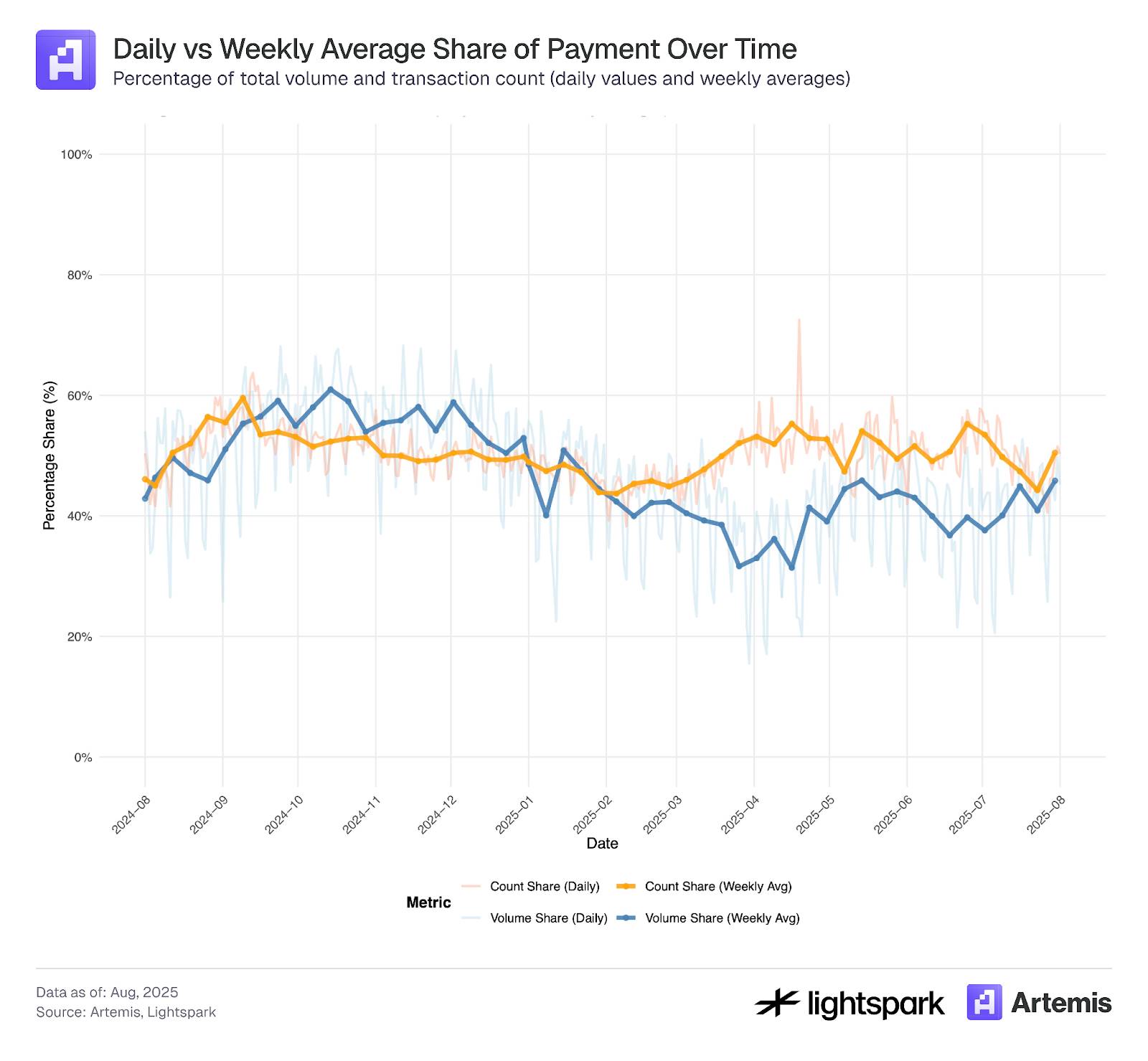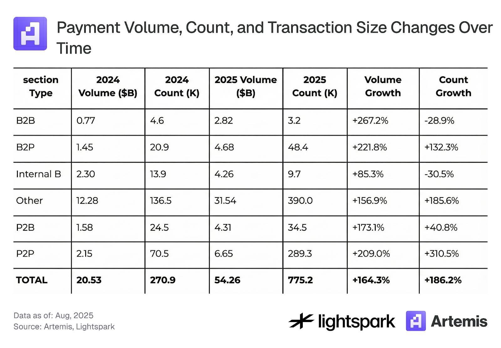 图 5 聚焦于按周计算的变化情况,显示所有类别的支付交易量呈现出一致的采用趋势和周交易量的增长。表 4 进一步总结了 2024 年 8 月至 2025 年 8 月期间的总体变化。