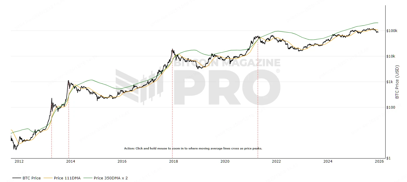 历史上,Pi Cycle Top Indicator 在每轮牛市顶部前都有交叉表现: