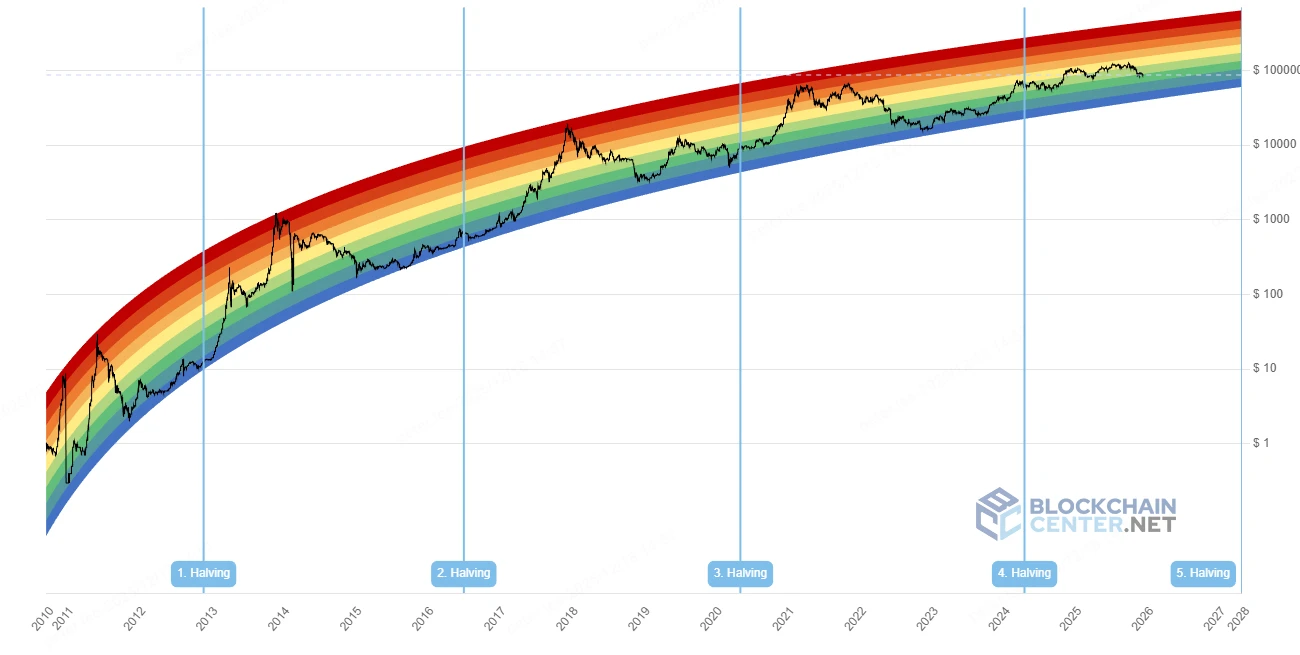 Bitcoin Rainbow Chart 使用对数增长曲线叠加彩虹色带,评估比特币的长期估值水平。