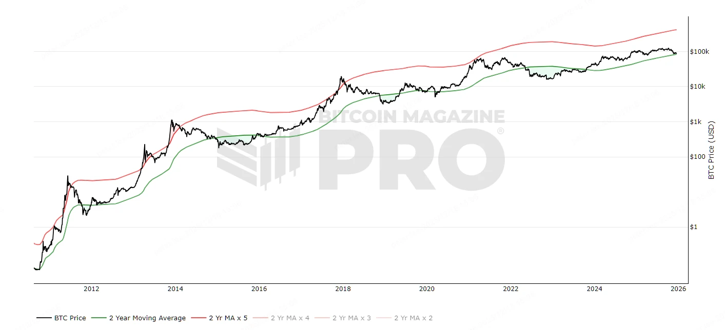 2-Year MA Multiplier(也称 Golden Ratio Multiplier)通过 2 年移动平均线乘以斐波那契比率,识别价格阻力区。